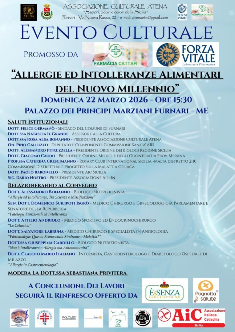 FURNARI (ME) – Sabato 22 marzo 2026, alle ore 15:30, la storica cornice di Palazzo Marziani diventerà il centro del dibattito scientifico siciliano. L’Associazione culturale ATENA, guidata dalla Dott.ssa Rosa Alba Bonanno, presenta l’evento “Allergie e intolleranze alimentari del nuovo millennio”.