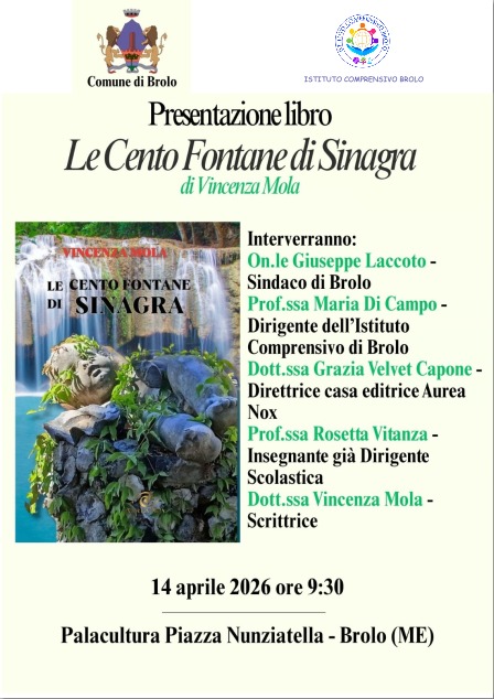 BROLO (ME) – C’è un filo d’acqua che lega la storia geologica di un territorio a quella, più intima e pulsante, dei suoi abitanti. È questo filo che Vincenza Mola ha deciso di dipanare nel suo ultimo lavoro, “Le cento fontane di Sinagra”, che verrà presentato ufficialmente martedì 14 aprile 2026, alle ore 10:00, nella cornice del Palacultura in Piazza Annunziatella, a Brolo.