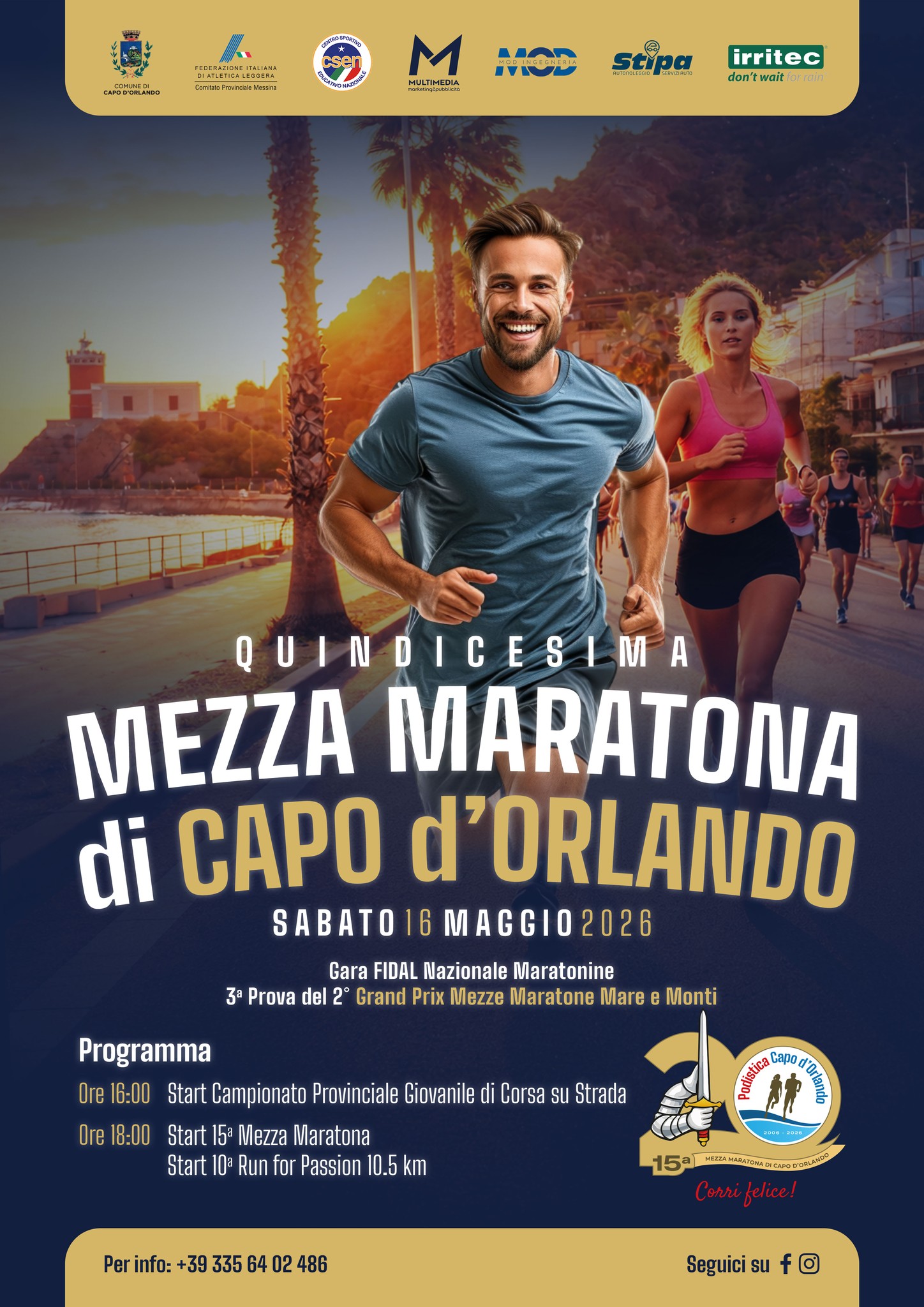 Capo d’Orlando si prepara a vivere una giornata di grande sport e partecipazione con un doppio appuntamento ormai entrato nel cuore dei runner siciliani. Sabato 16 maggio 2026, sul suggestivo Lungomare Andrea Doria, andrà infatti in scena la 15ª edizione della Mezza Maratona Città di Capo d’Orlando, affiancata dalla 10ª Run For Passion, evento che abbraccia anche il mondo giovanile con il campionato proviciale dedicato proprio ai più piccoli. Uno spazio ai giovani con il campionato provinciale e un’organizzazione pronta ad accogliere centinaia di runner tra agonismo e passione.