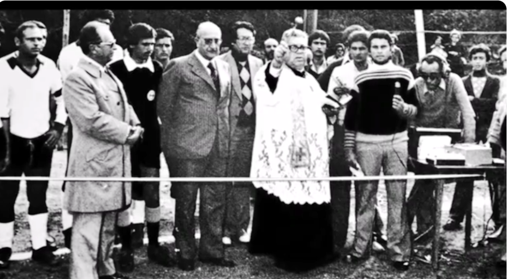 (Padre Passalcqua inaugura lo Stadio delle Palme , (da sinistra il  Prof Mimmo Di Meo , il Sindaco Cap Catanzaro, il presidente Alberto Lo Duca  e Don Ciccio Foti cronista di Radio Milazzo Inter.le)
