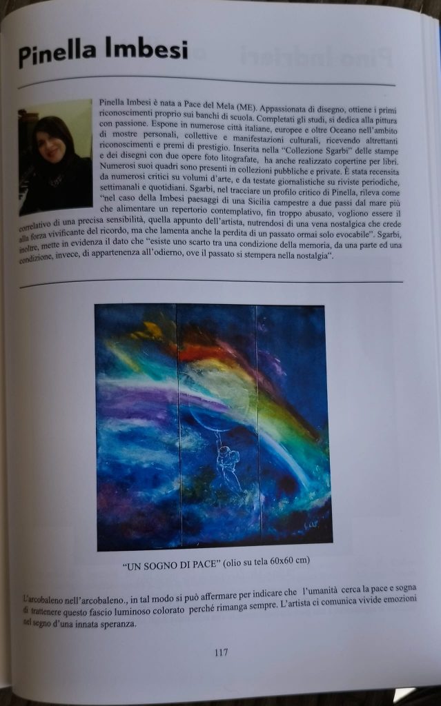 Tra le cento anime che hanno aderito a questa missione universale, spicca il nome di un’artista siciliana di grande rilievo: Pinella Imbesi. Originaria di Pace del Mela, l’artista ha partecipato al volume con l’opera dal titolo emblematico “UN SOGNO di PACE”.