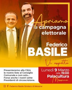 Dopo una maratona di incontri nei villaggi, il candidato sindaco Federico Basile è pronto a dare il via formale alla sua corsa per la riconferma. L’appuntamento è fissato per stasera, lunedì 9 marzo 2026, alle ore 19:00, nella cornice del Palacultura di Messina.