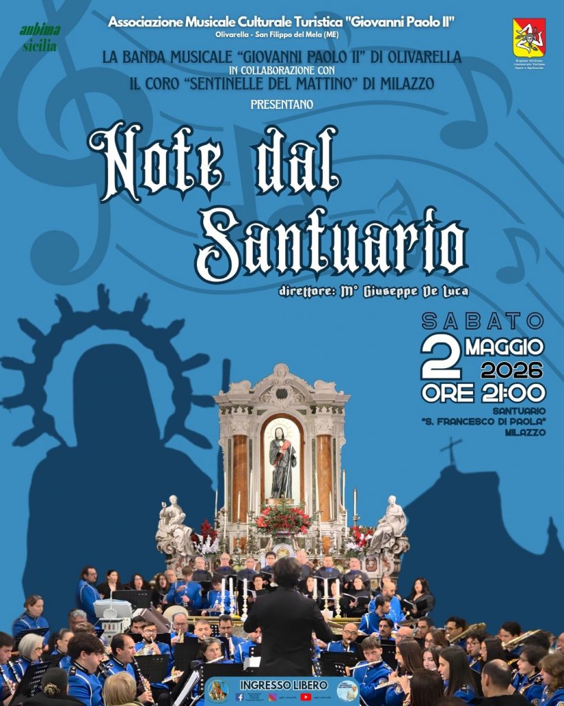 Il Santuario di San Francesco di Paola è una cornice magnifica, e la collaborazione tra l’Associazione “Giovanni Paolo II” e il Coro “Sentinelle del Mattino” promette un’atmosfera suggestiva, specialmente sotto la guida del Maestro Giuseppe de Luca. In occasione dei festeggiamenti di San Francesco di Paola si rinnova il tradizionale appuntamento serale all’insegna della buona musica, dell’emozione e della condivisione con il Concerto della Banda Musicale dell’Associazione “Giovanni Paolo II” di Olivarella, presieduta da Domenico Mendolia. Ad arricchire ulteriormente i due concerti sarà la prestigiosa collaborazione con il Coro “Sentinelle del Mattino” di Milazzo, realtà corale storica e profondamente radicata nel territorio. Banda e coro saranno diretti dal Maestro Giuseppe De Luca, musicista e direttore di grande esperienza e figura di riferimento per entrambe le formazioni, garanzia di qualità artistica ed equilibrio espressivo.