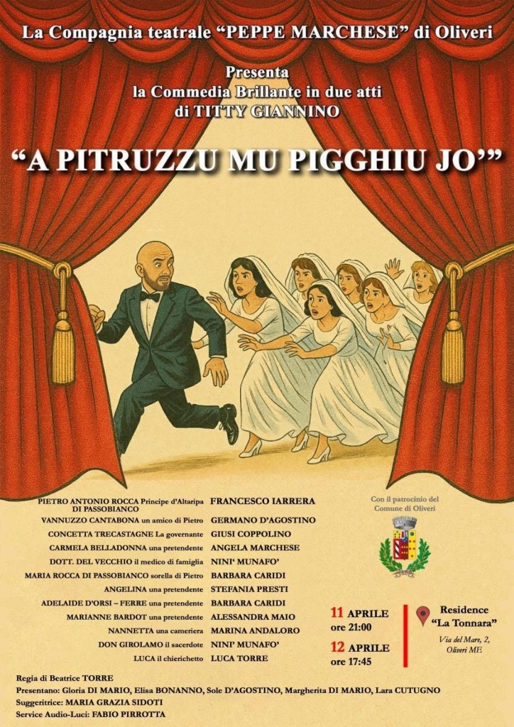 OLIVERI – Il sipario sta per alzarsi su un nuovo weekend di spettacolo nel cuore di Oliveri. La Compagnia Teatrale “Peppe Marchese”, con il patrocinio del Comune, presenta l’attesa commedia brillante in due atti dal titolo “A Pitruzzu mu pigghiu jo’”, scritta dalla penna di Titty Giannino.