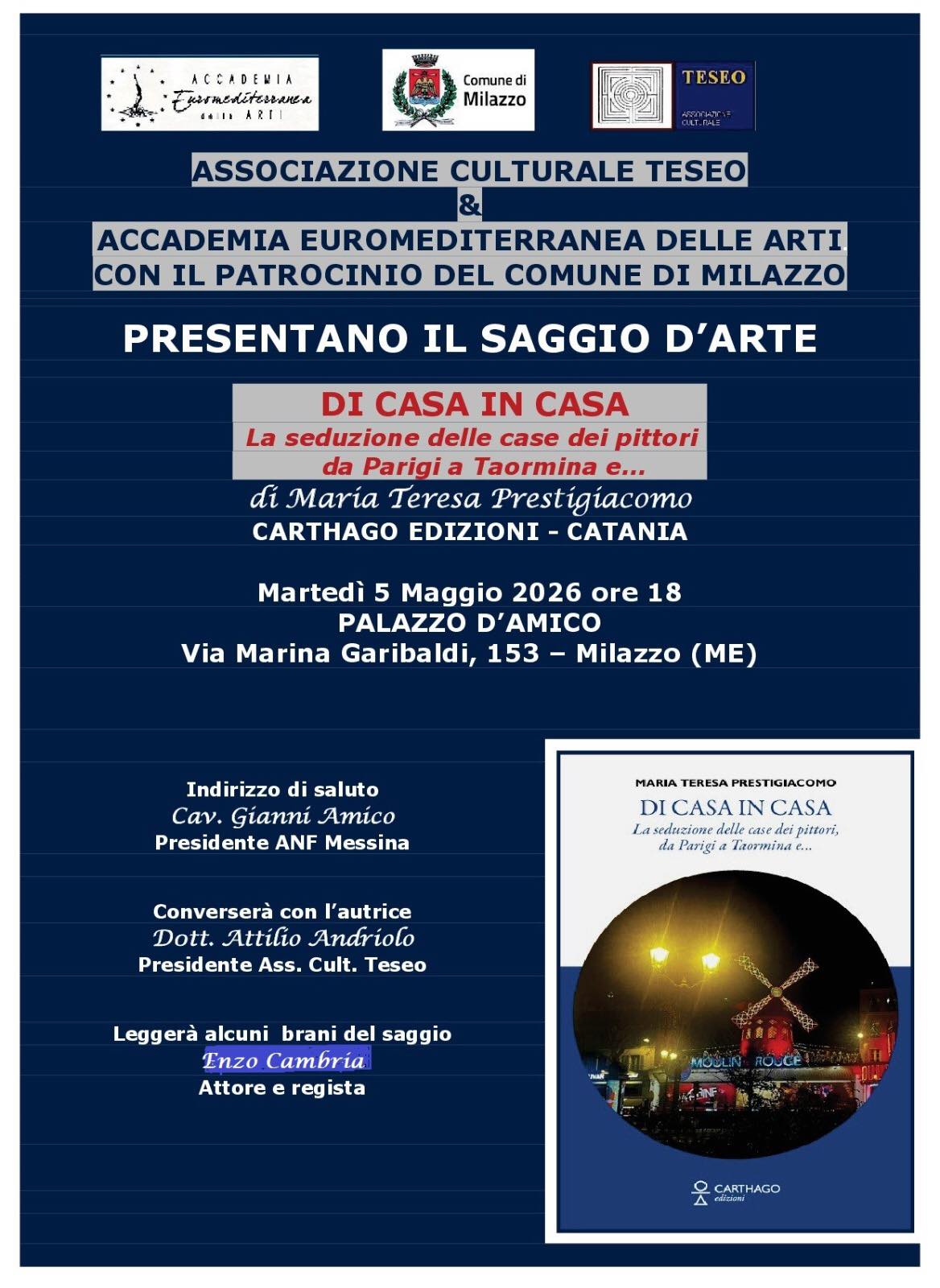 Milazzo: Martedì 5 maggio, ore 18:00 Palazzo D’Amico, sarà presentantato il Libro della scrittrice, Prof.ssa Maria Teresa Prestigiacomo, (giornalista e critico), autrice dell’opera letteraria “Di Casa in casa” La seduzione delle case dei pittori da Parigi a Taormina e…” (Carthago Edizioni)