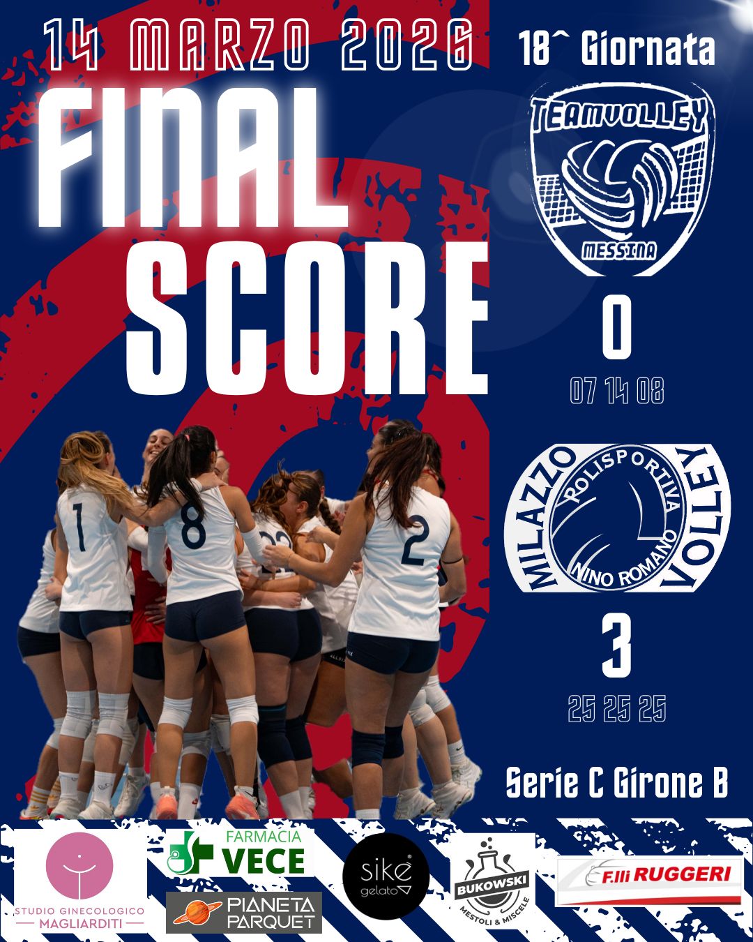 In una trasferta atipica (giocata al PalaCiantro) arriva una vittoria importante nella prestazione. Team Volley Messina – Polisportiva Nino Romano 0-3 (7-25, 14-25, 8-25) Per indisolibilitΓ  dell’impianto messinese , la gara della 18Γ¬ giornata si Γ¨ disputa a Milazzo . Un turno che ha interessato la quasi totalitΓ  delle torneo .ad eccezione della capolistaΒ NEW AMANDO IONICA VOLLEY*Β  Β  inpegnata in caso in una semifinaleΒ  di Coppa Sicilia