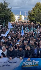Tanta gente venuta dall’hinterland, dai Comuni della città metropolitana di Messina e anche tanti calabresi venuti non solo dalla dirimpettaia Reggio Calabria ma fino Cosenza. Rappresentanti di categorie associative, Confindustria, Ance, imprenditori, professionisti, giovani studenti e molte bandiere, ben oltre 40 sigle.