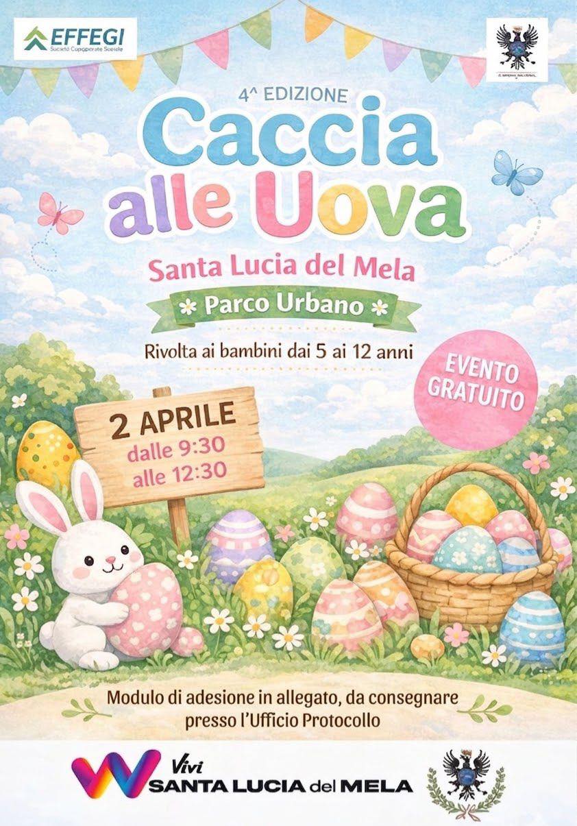 Il Comune di Santa Lucia del Mela , dopo il successo delle precedente iniziatve apre di giardini comunali per che garantire il divertimento di adulti e di piccini, nei giorni di Pasqua e Pasquetta oppure nella settimana che precede queste festività si possono organizzare tante attività divertenti per i bambini.