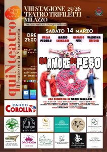 L’appuntameno è per il prossimo Sabato 14 Marzo 2026, alle ore 21:00 , in scena il testo UN AMORE DI PESO – del registra e autore Marco Cavallaro