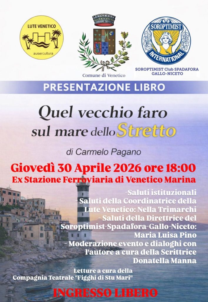 Venetico: giovedì 30 Aprile 2026 , ore 18:00 , l’Università Terza Età, diretta dalla Prof Nella Trimarchi , Soroptimist Club Spadafora – Gallo Niceto , con il patrocinio del Comune di Venetico presentono l’ultima opera dello scrittore Carmelo Pagano dal titolo “Quel vecchio faro sul mare dello Stretto ” ed (Kimerik, 2026). Il Dott Pagano è un autore italiano, noto per le sue opere legate alla cultura e ai paesaggi siciliani, edite principalmente da Kimerik. Tra i suoi titoli recenti figurano il romanzo “Una terra, una famiglia” (2025), “Il mare di Vaccarella” (2023) e “L’anima della Sicilia” (2024).